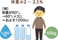 1日に必要な水分は、体重の2〜2・5%と言われています。体重が60`の人であれば、およそ1200ccで十分ということになります(図1)。もちろん夏場や汗をかいた場合は、もっと多くの水分を必要とすることもあるでしょう。一方で、汗をあまりかかない冬では、水分はほぼそのまま尿として排出されるため、どうしてもトイレに行く回数が増えます。 |