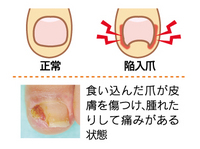 陥入爪とは、爪が食い込んで爪の横の皮膚を傷つけ、赤くなったり腫れたりして痛みがある状態のことです。赤く盛り上がって、出血しやすい肉芽を形成することもあります。 |