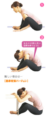 (1)ひざを曲げてゆっくり座り、両手をひざの下をくぐらせ、手のひらを床につける(カメの甲羅から足が出ているように)。 |