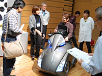 車いすや電動カートの代用となる「ユニバーサルビークル・ロデム」(テムザック製)は後方から乗り込め、胸や膝、お尻で体重を支えながら前傾姿勢で運転できる。サドルの高さは38〜70センチまで上下し、高い所に手を伸ばすことも可能。操縦は、行きたい方向にレバーを回すと進む仕組み。試乗した安武育子さん(77)=熊本市=は「簡単に行きたい方向に進め、軽い乗り心地でした」と満足げだった。