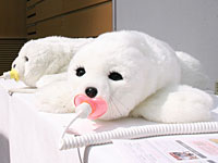 まん丸い大きな瞳とふかふかの毛並みがかわいらしい「メンタルコミットロボット・パロ」(知能システム製、展示協力・大和ハウス工業)は、タテゴトアザラシの赤ちゃんがモデル。人間の声や言葉に反応して鳴き、なでると目を閉じて気持ち良さそうな表情を見せる。熊本市の橋博子さん(65)は「骨折してリハビリ中の90歳の母へのプレゼントとして興味を持ちました」と、その癒やし効果に注目していた。